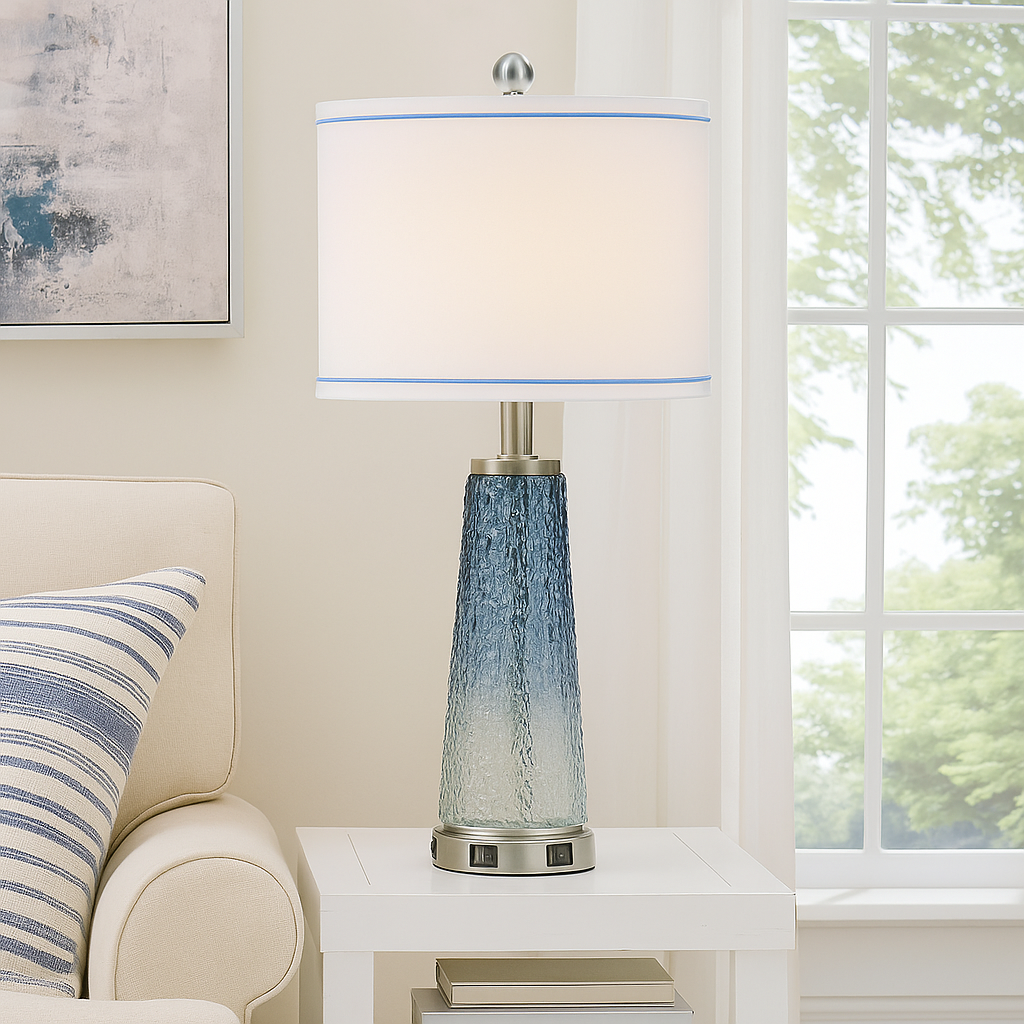 2-in-1 table lamp with nightlight. Indigo glass body. Charging ports & AC outlet. Drum shade, touch dimming switch (Set of 2)