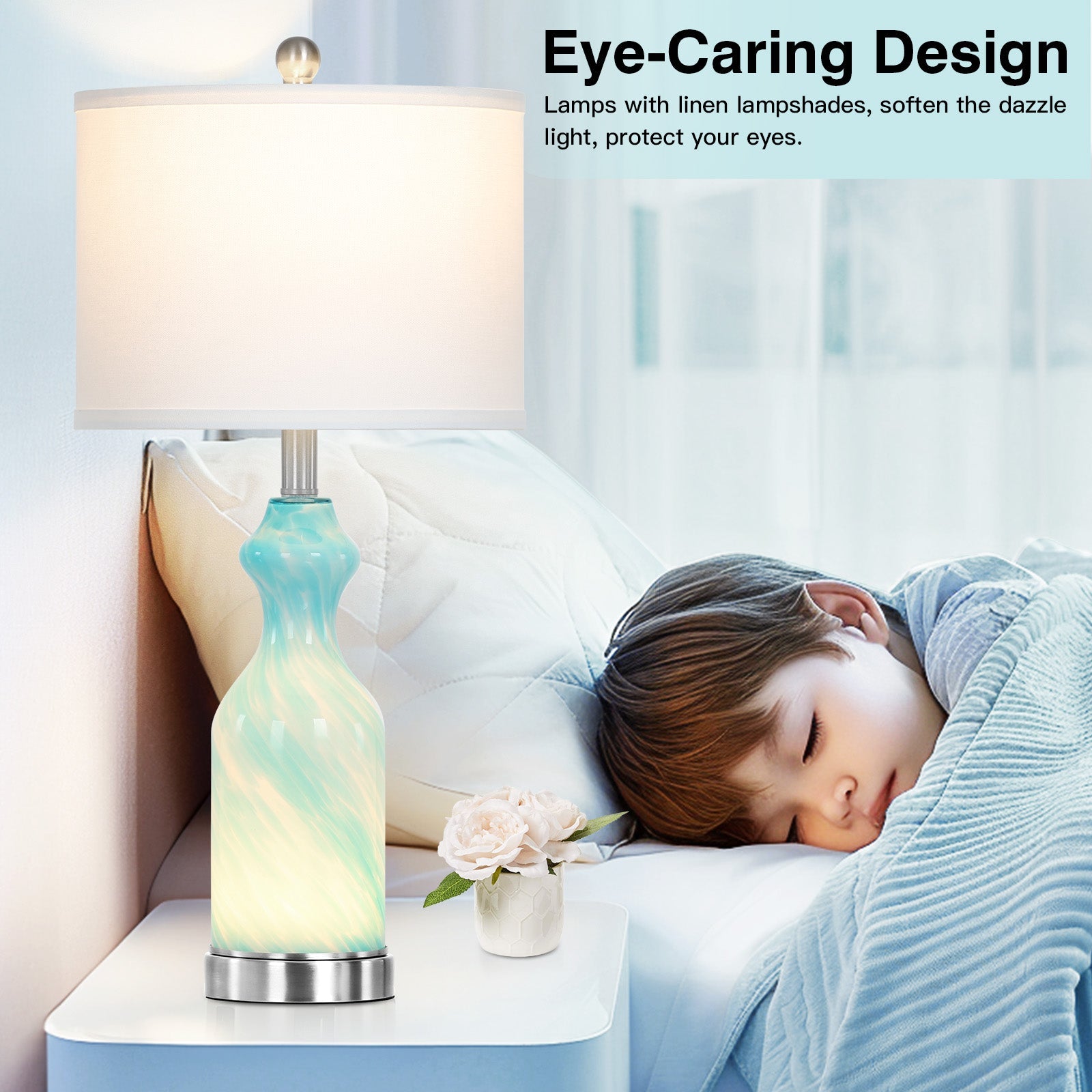 2-in-1 Blue Glass Table Lamp with Nightlight Function and Equipped with USB and Type-C Charging Ports (Set of 2)