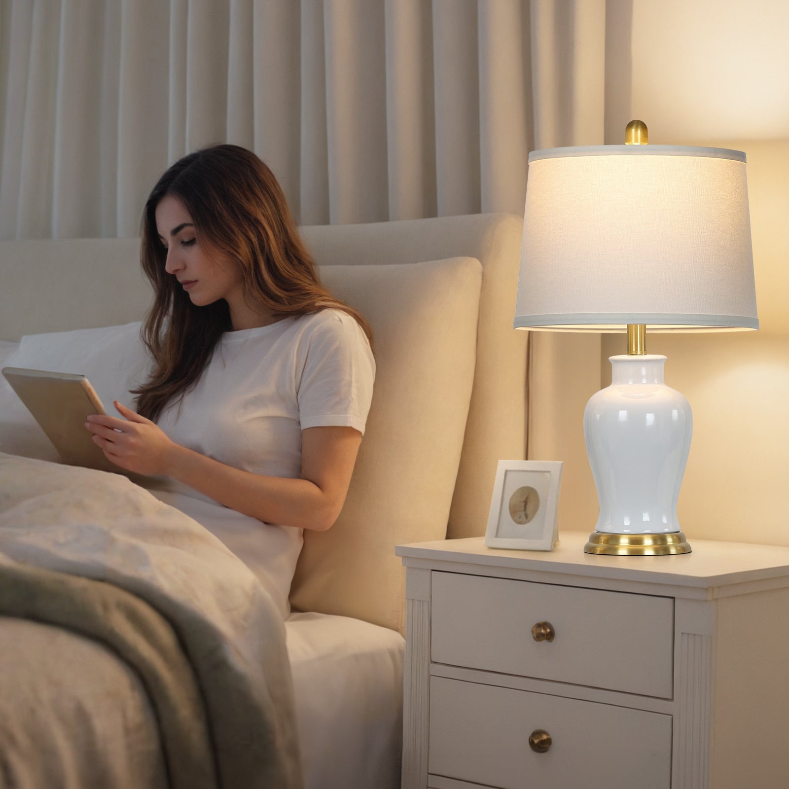 23'' White Ceramic Ginger Jar Table Lamp with White Fabric Shade and LED Bulb
