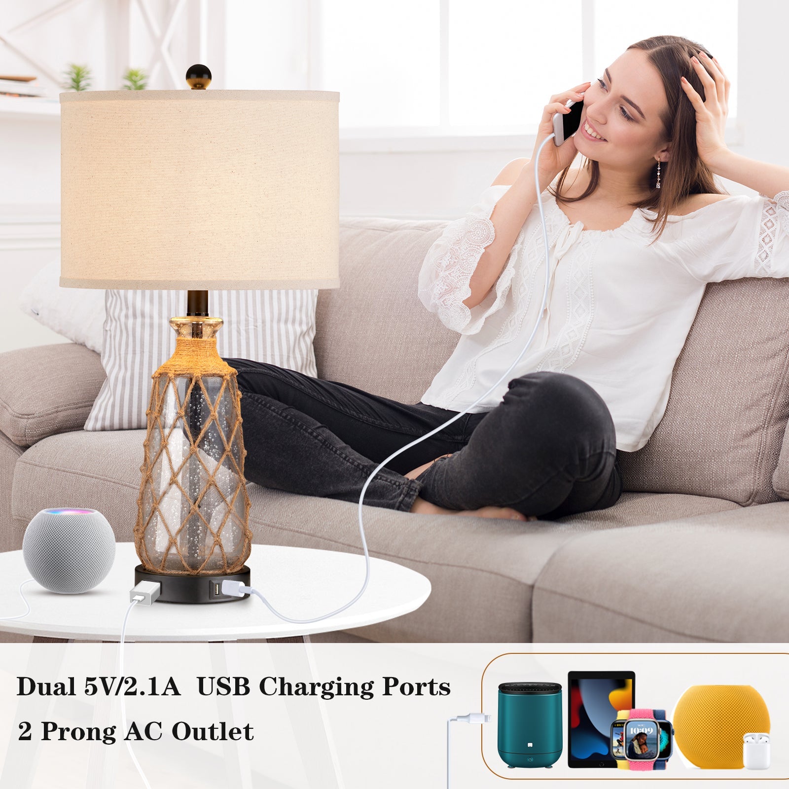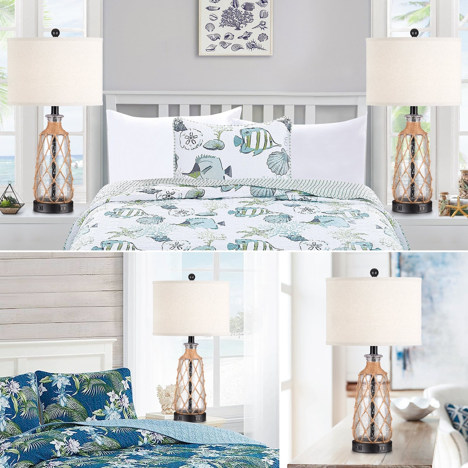 Brown glass rattan table lamp with touch dimmer, USB port and AC outlet (Set of 2)
