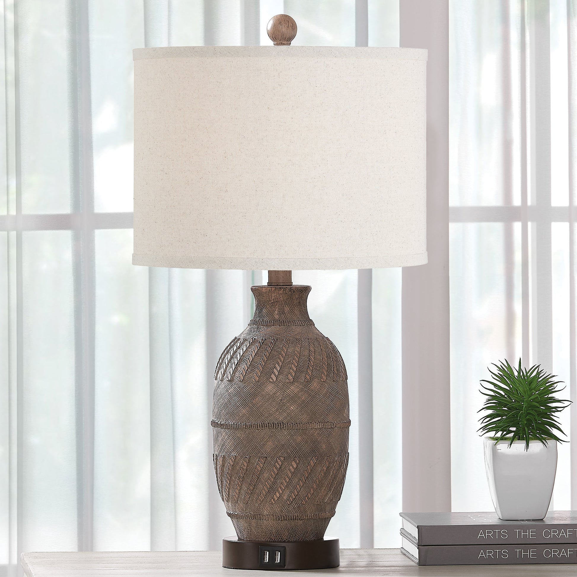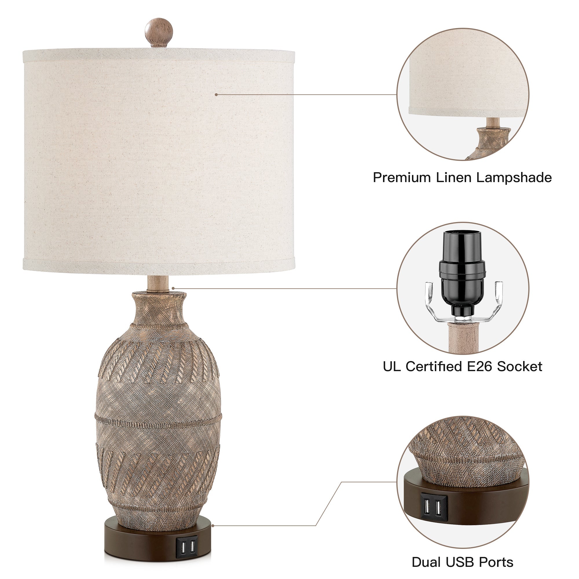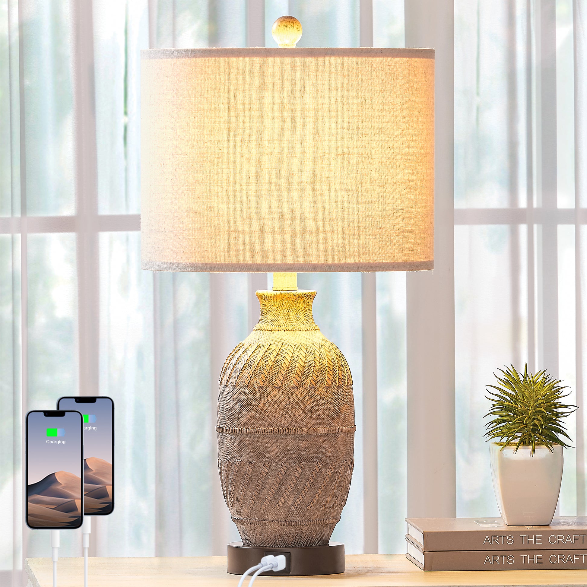 Cinkeda Table Lamp Grey Resin 3-Way Touch Dimming USB Ports