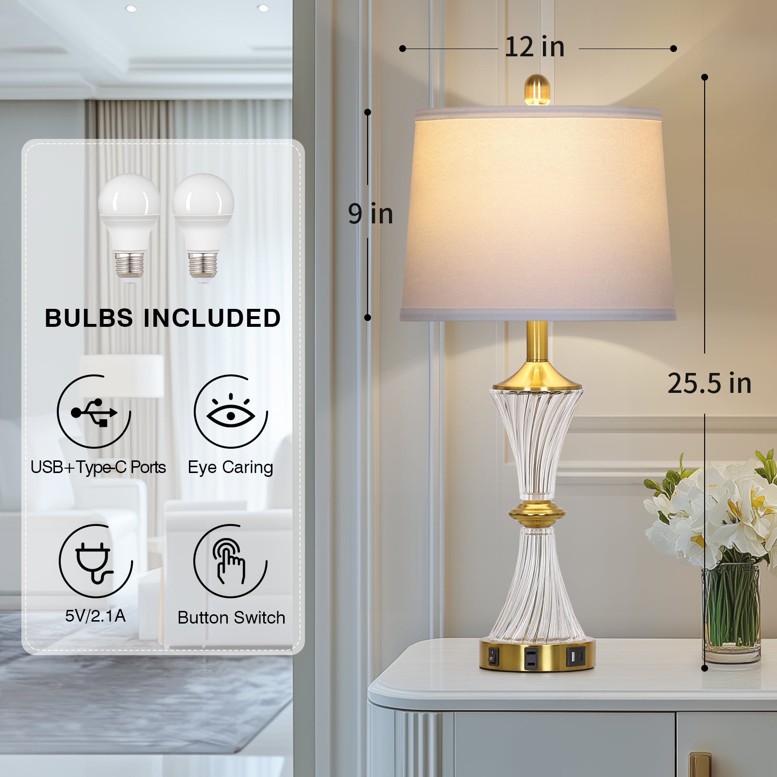 Elegant Table Lamp with USB-C & USB Charging Ports, Brass and Glass Design(Set of 2)