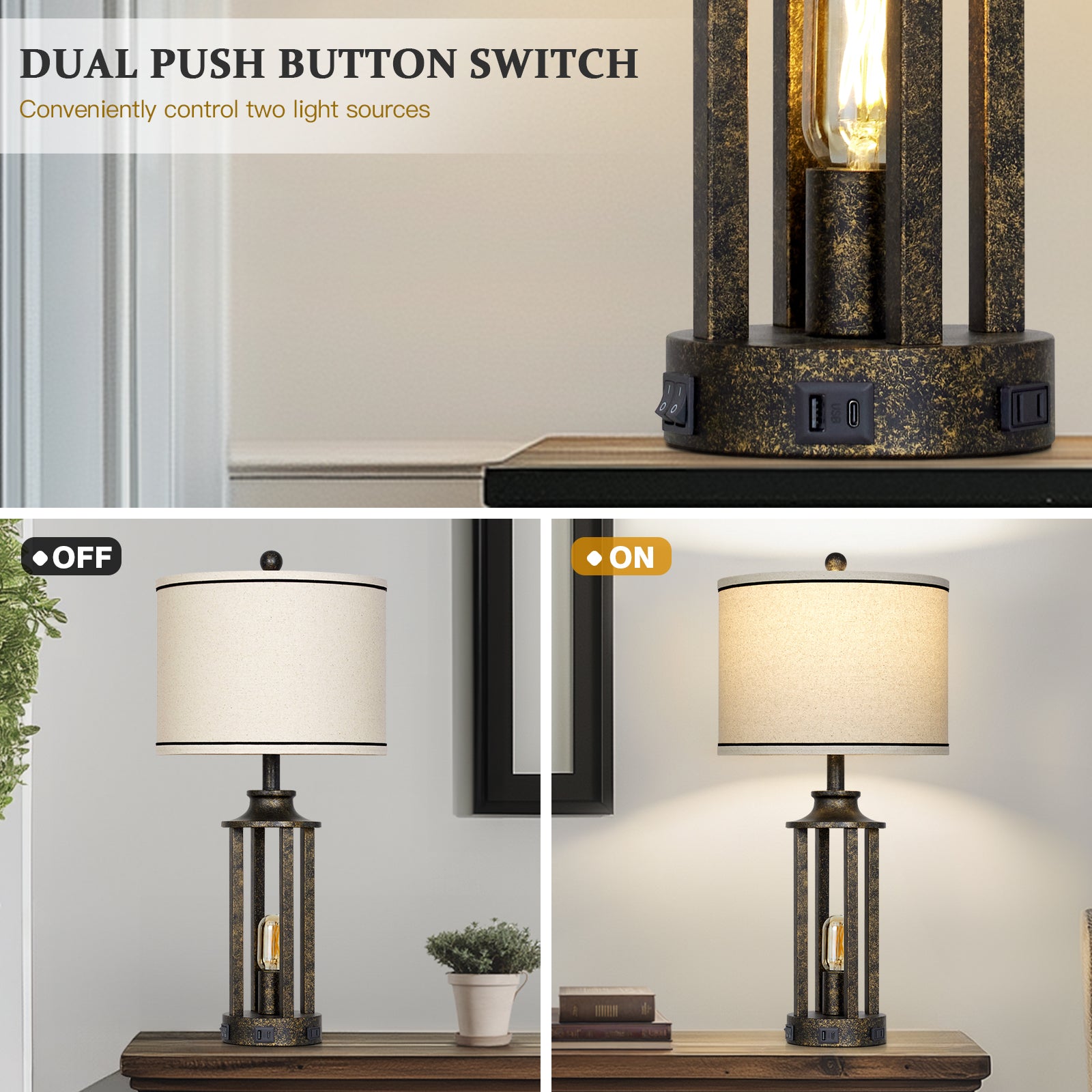 Industrial Dual Lighting Table Lamp with USB-C & AC Outlets, Vintage Metal Cage Design(Set of 2)