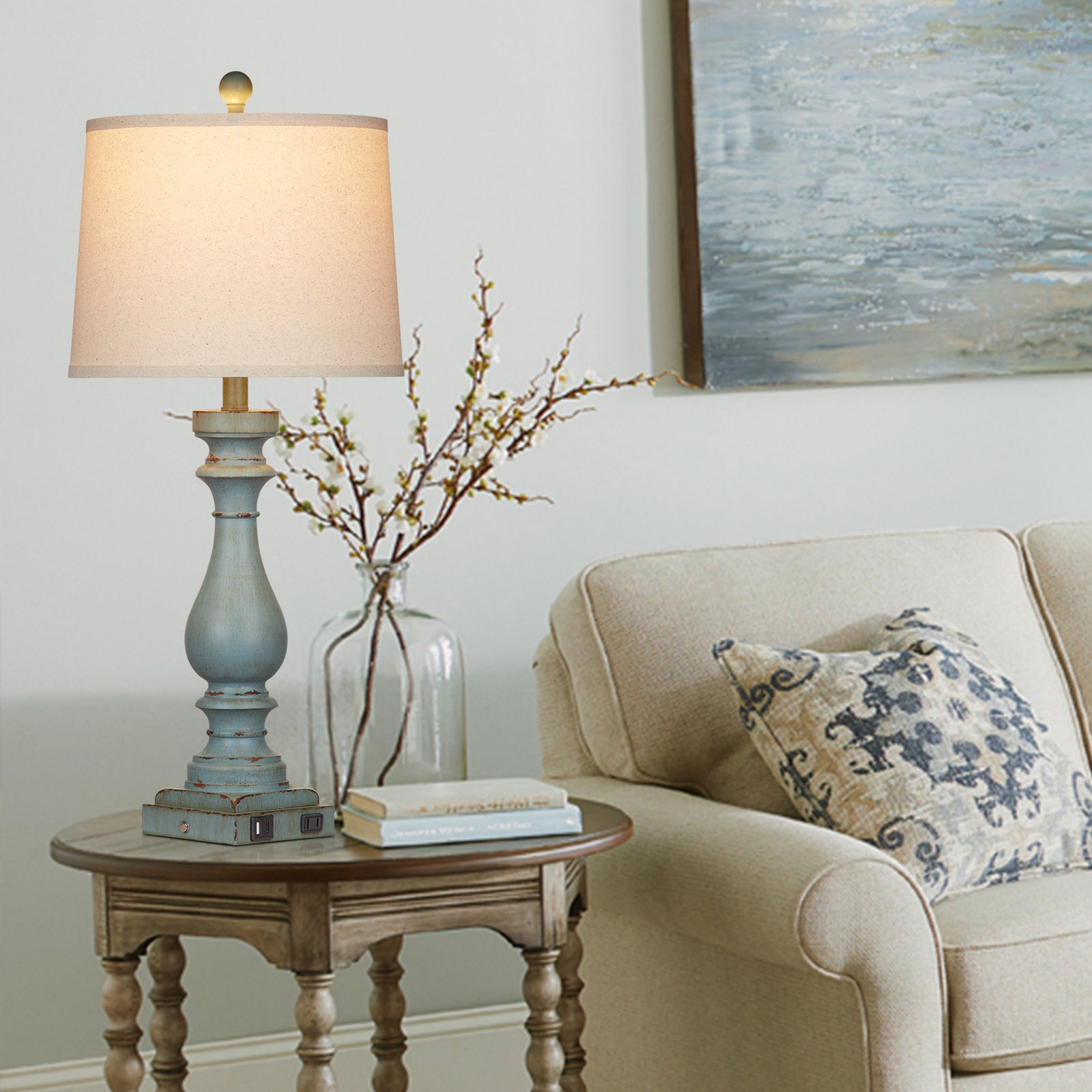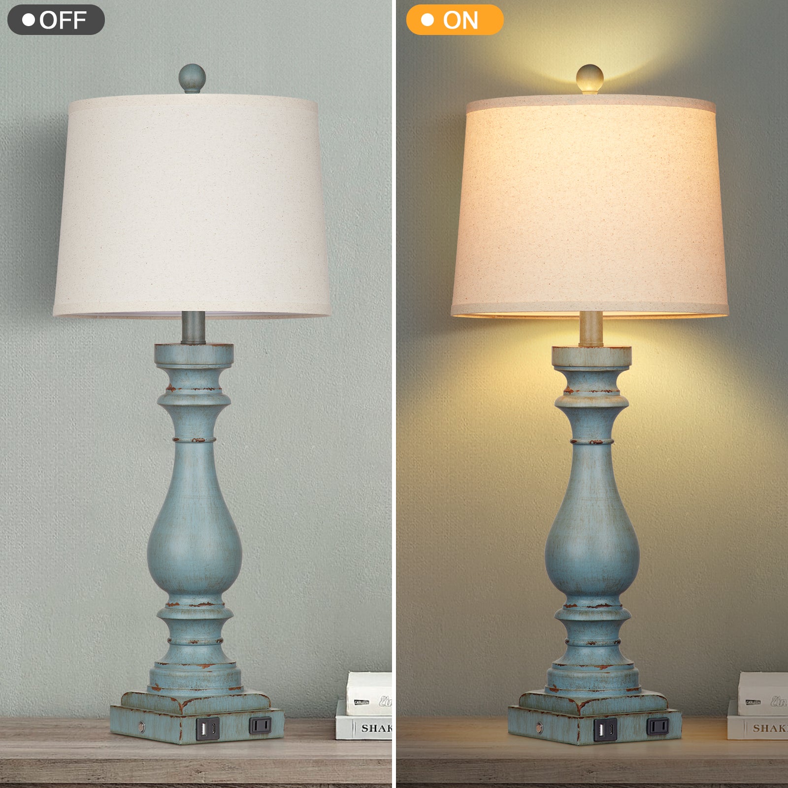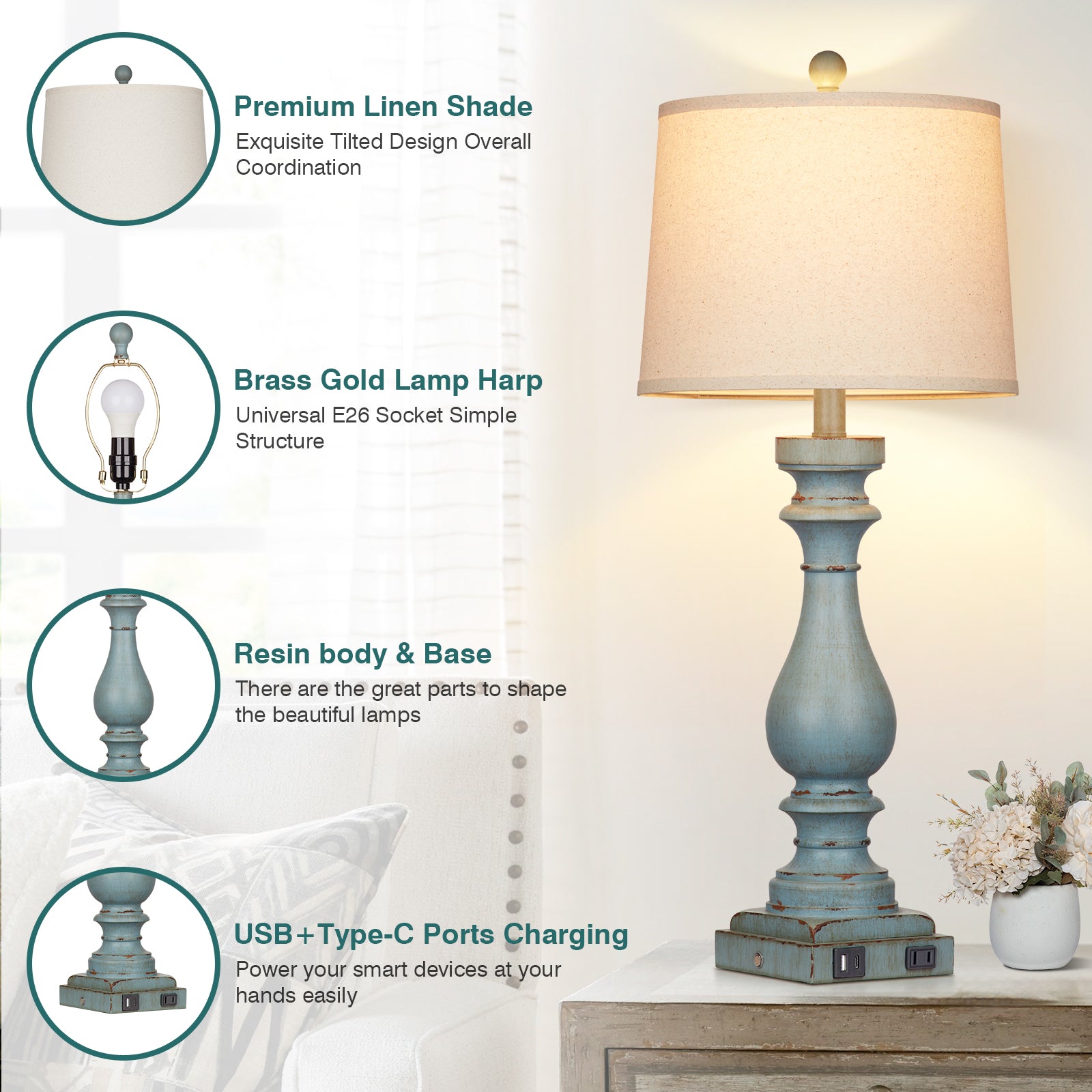 Blue Resin Drop Style Table Lamp with Tilted Shade, featuring 3-Way Dimming Touch Switch, USB Type C Charging Ports and AC Outlet, and No Strobe (Set of 2)