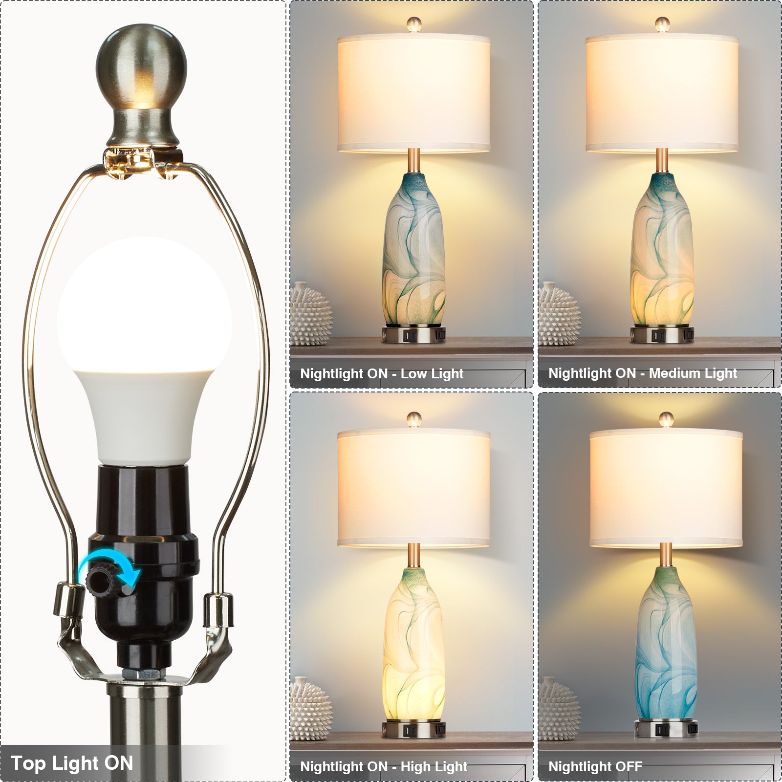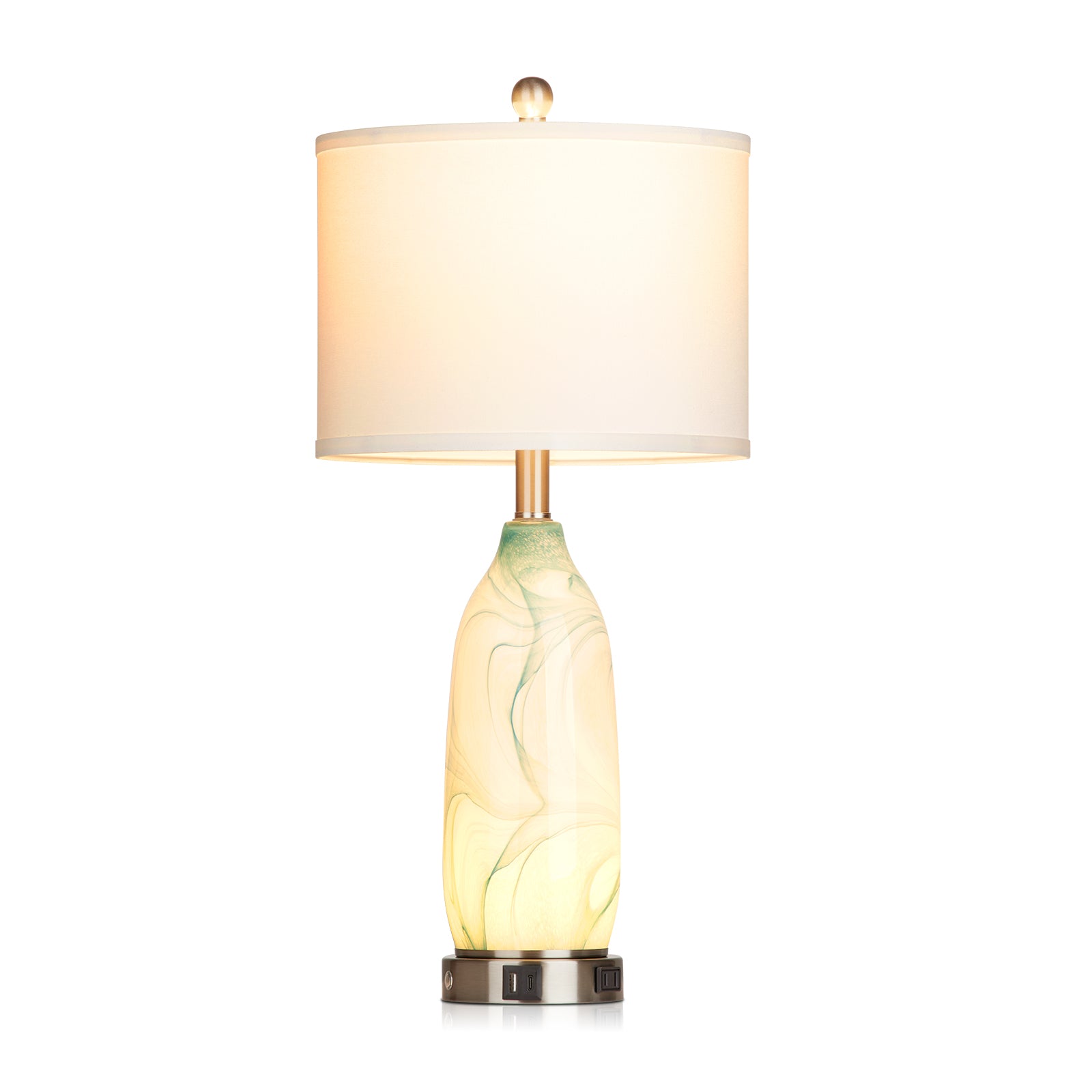 2-in-1 table lamp with nightlight. Blue glass lamp body. Charging ports & AC outlet. Drum shade. Touch switch (Set of 2)