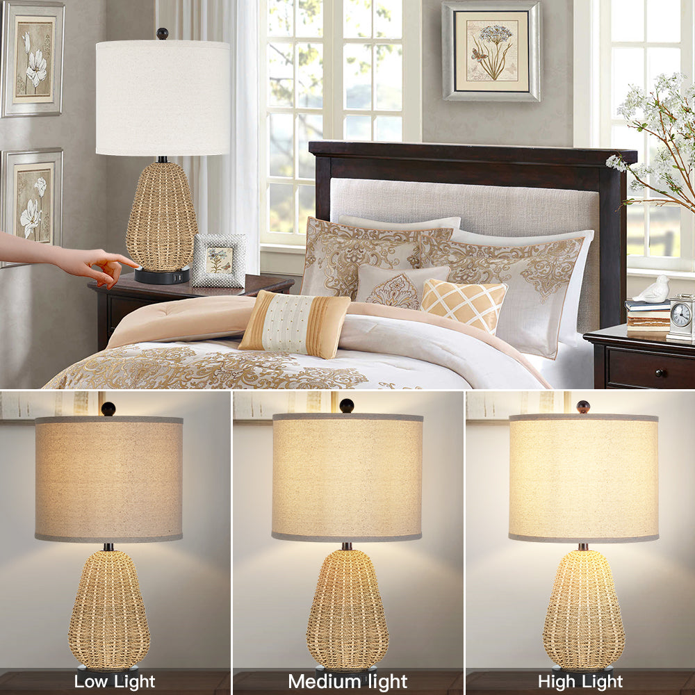 - Experience the convenience of our 3-way dimmable touch control. Engineered for versatile lighting, these woven living room table lamps offer three distinct brightness levels, accommodating various lighting requirements. With a simple tap on any part of the lamp bases, effortlessly switch between illumination intensities. This responsive touch control spares you the frustration of grappling with switches in the dark. Choose low grade for a gentle nightlight glow, mid-grade for everyday illumination, and high grade for focused tasks like reading, studying, or working.