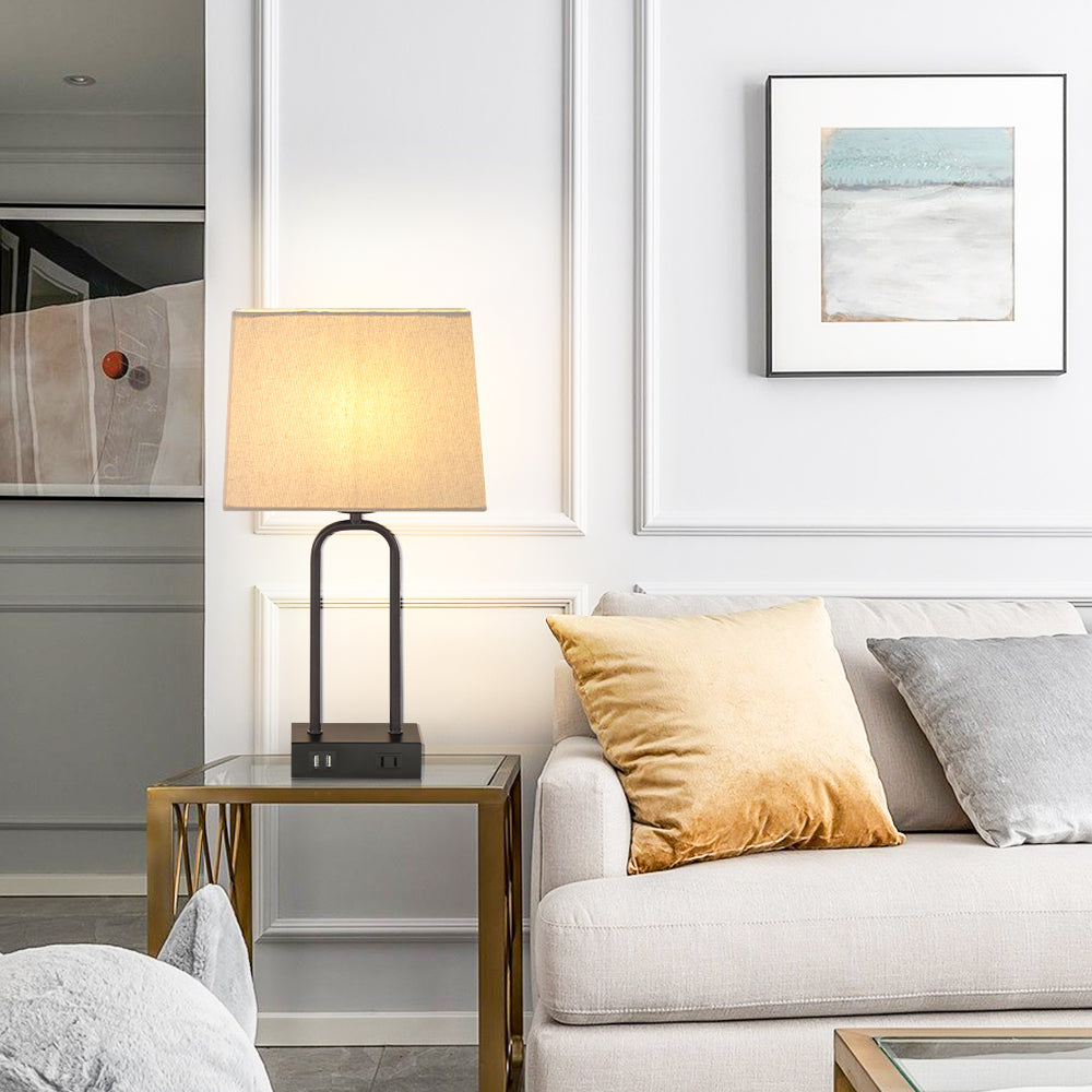 Sleek Minimalism: Embrace the allure of modernity with our table lamps, featuring a sleek rectangular design. The rust-proof matte black metal bracket seamlessly combines with a wooden-textured base, creating a minimalist masterpiece that elevates the ambiance of any room. Even when unlit, these lamps effortlessly draw attention, adding a touch of classic and contemporary charm to your living space. Perfect for bedrooms, living rooms, offices, cafes, hotels, apartments, and guest rooms, these lamps merge style and practicality. Effortless Charging Convenience: Enhance your bedside experience with our lamp, equipped with 2 convenient USB ports (5V/2.1A) and a practical AC outlet (120V). Charging your devices becomes a breeze, whether the lamp is on or off, eliminating the clutter of extra power cubes and keeping your space tidy. Duo of Modern Elegance: Discover our set of 2 contemporary table lamps, each standing at 18" in height. The premium linen lampshade boasts built-in insulation to protect your eyes from harsh glare, providing gentle, soothing illumination that blankets your room and reduces eye fatigue. These lamps are not just functional; they are a thoughtful gift choice, combining aesthetics and practicality in a way that your loved ones will truly appreciate. Complimentary LED Bulb Included: Experience hassle-free lighting with the included E26 LED bulb, equivalent to a 60W incandescent bulb. Say goodbye to flickering lights, excess heat, and energy inefficiency. The Cinkeda lamps create the perfect balance of illumination, crafting an intimate, cozy ambiance that promotes relaxation and tranquility. Intuitive 3-Level Touch Dimming: Experience lighting control like never before with our touch-sensitive lamps. Adjust the brightness with a simple tap anywhere on the lamp base. No more fumbling for switches in the dark. Choose the gentle low setting for a soothing nightlight, the middle setting for daily activities, or the radiant high setting for reading, studying, and focused work. Certified by UL: Rest easy knowing that the Cinkeda table lamp holds the esteemed UL certification, ensuring top-notch quality and safety. This mark of approval guarantees that the lamp meets rigorous safety and performance standards, providing you with peace of mind as you enjoy its radiant glow. Overview of features: