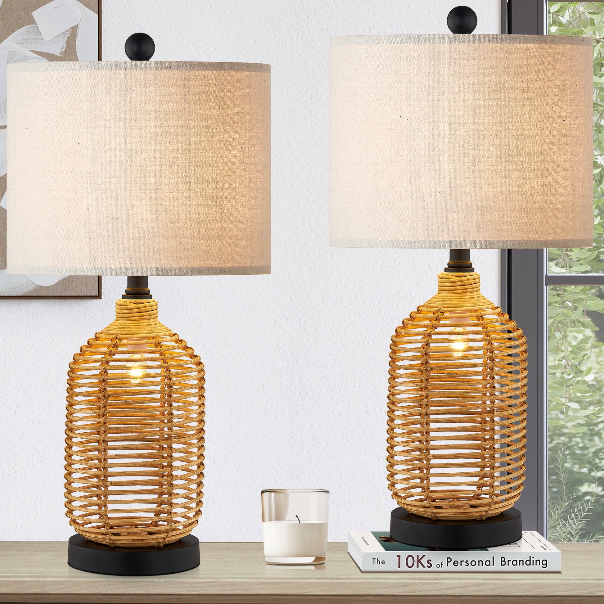 Cinkeda Table Lamp Nightlight 2in1 Brown Rattan 4-Way Switch(Set of 2)