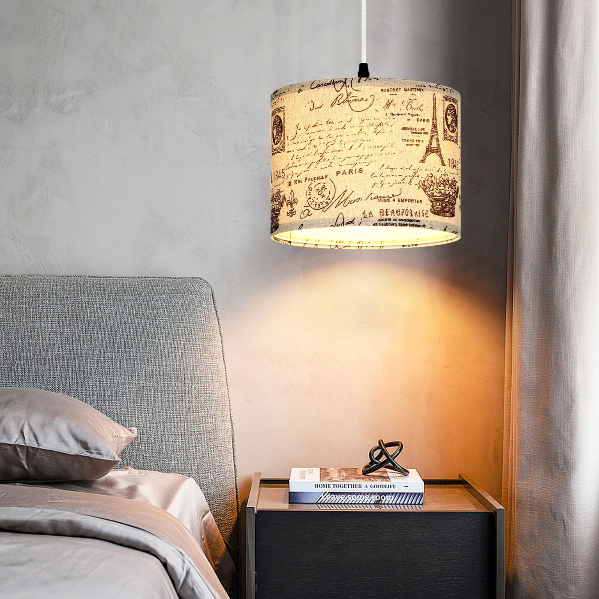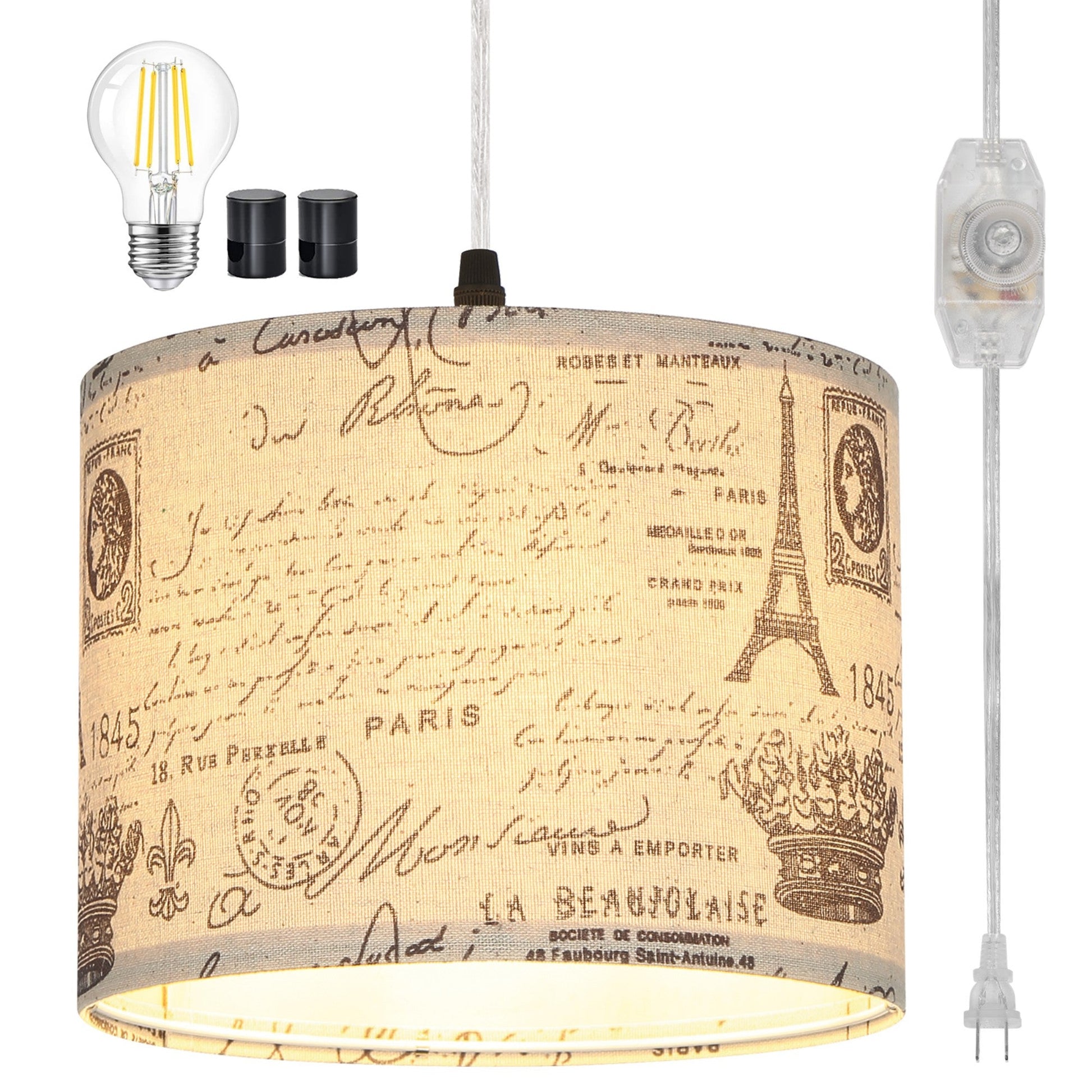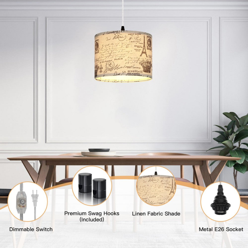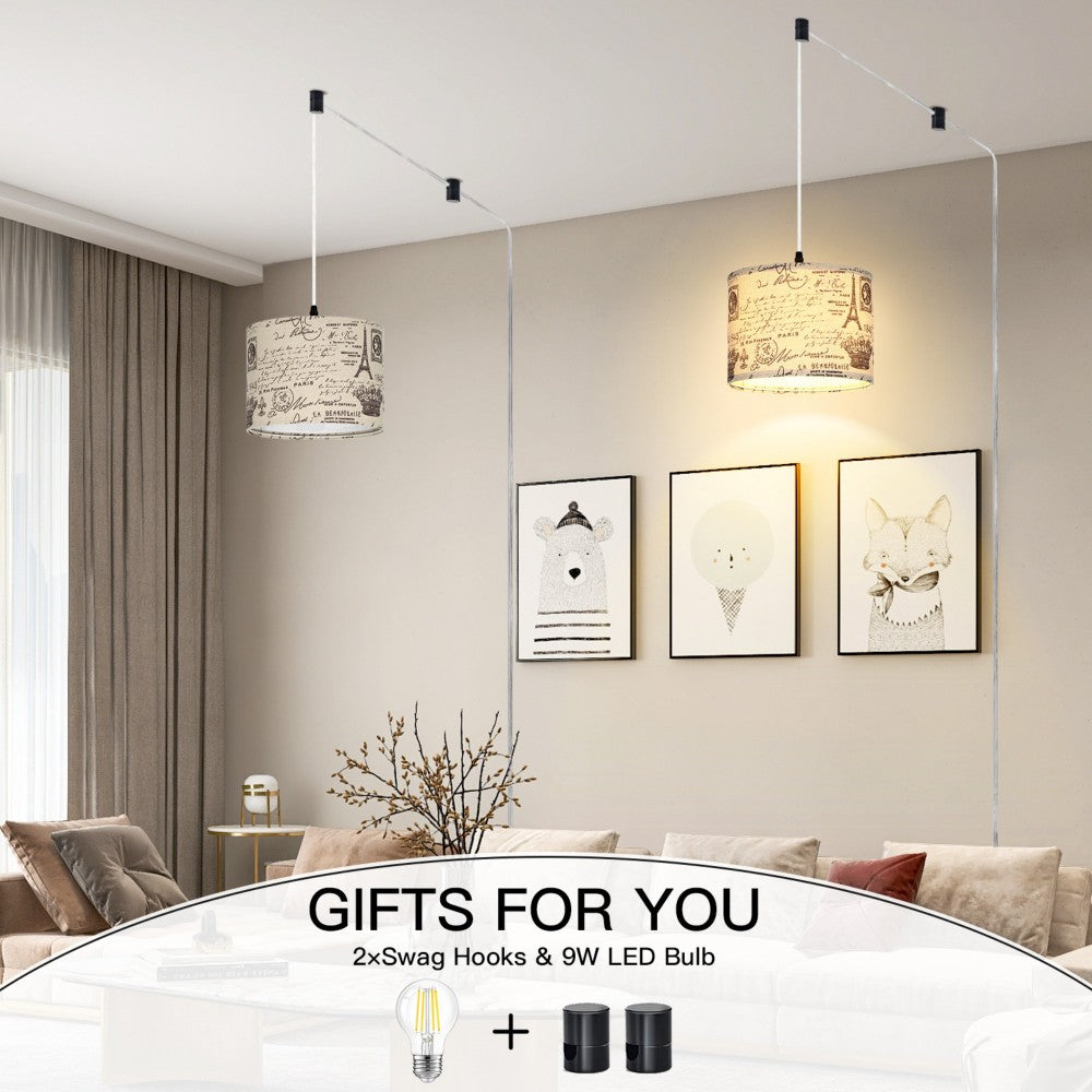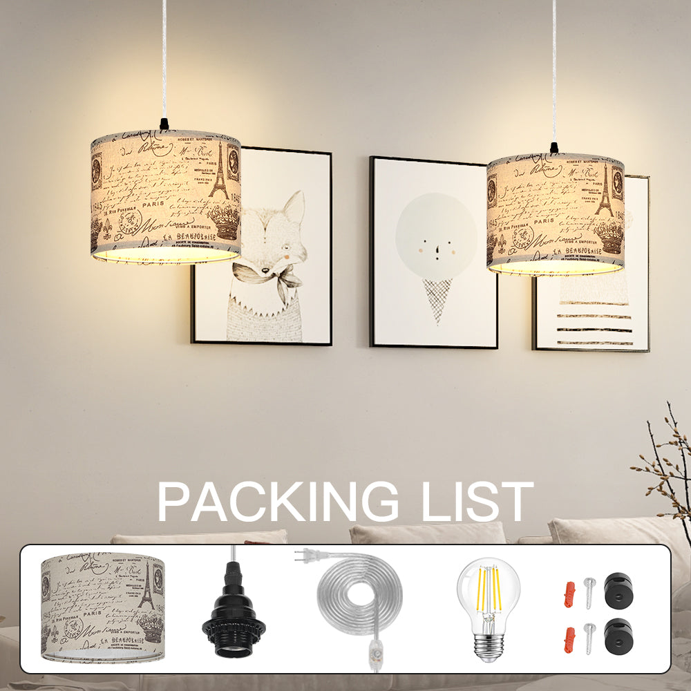 the transparent cord remains unharmed, catering to your installation needs across various ccasions. - Distinctive Romanesque Aesthetics: Our endant light boasts a one-of-a-kind omanesque print shade, seamlessly blending an Eiffel Tower motif into your living space. Elevate your home decor with a touch of medieval-inspired style. The Romanesque lampshade serves to gently diffuse the light, creating a comfortable and natural illumination free from flickering or glare. This contemporary plug-in chandelier is a perfect fit for spaces like bedrooms, living rooms, dining areas, children's rooms, and studies, effortlessly enhancing the ambiance.