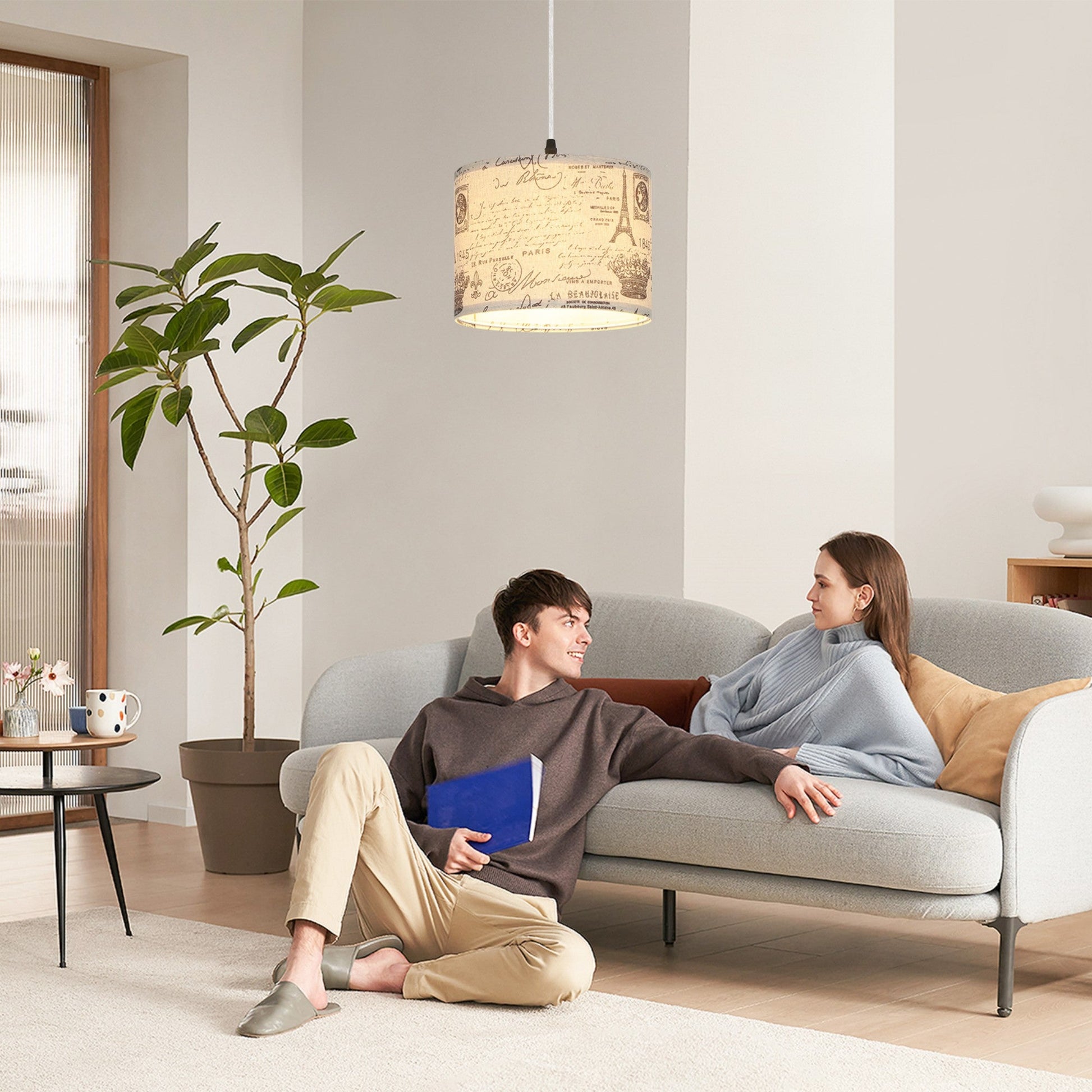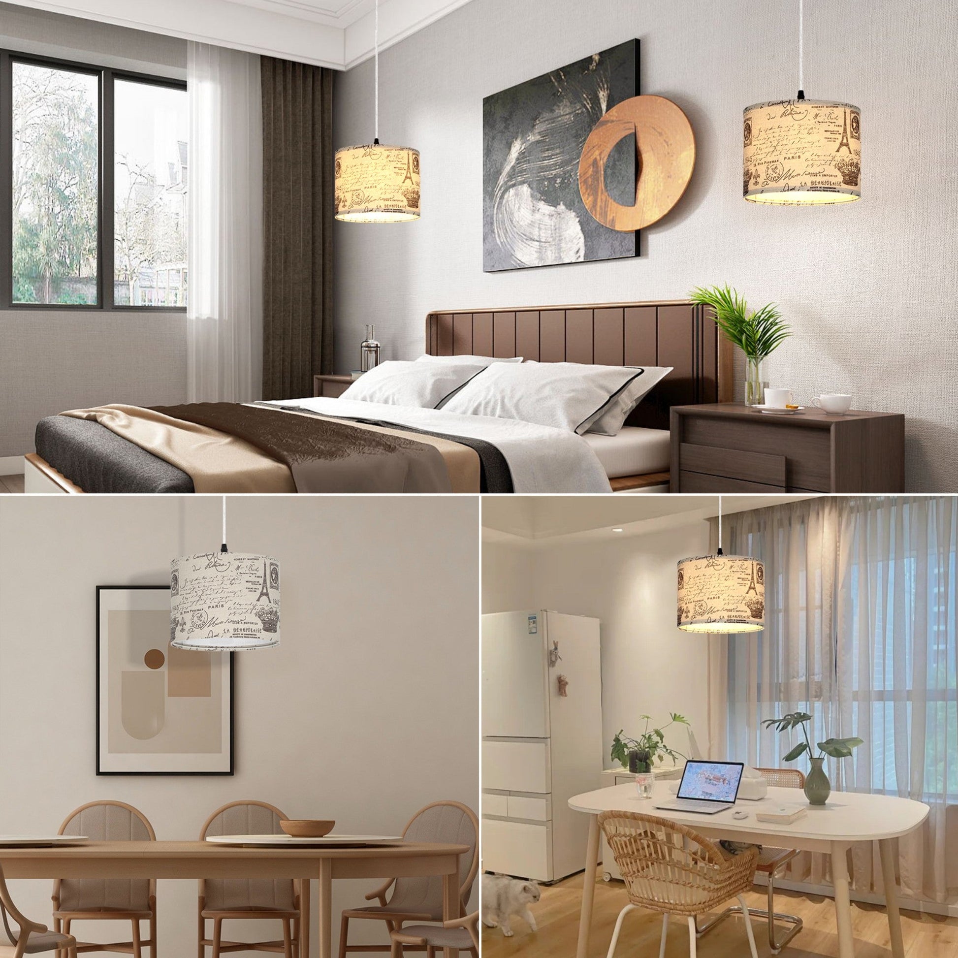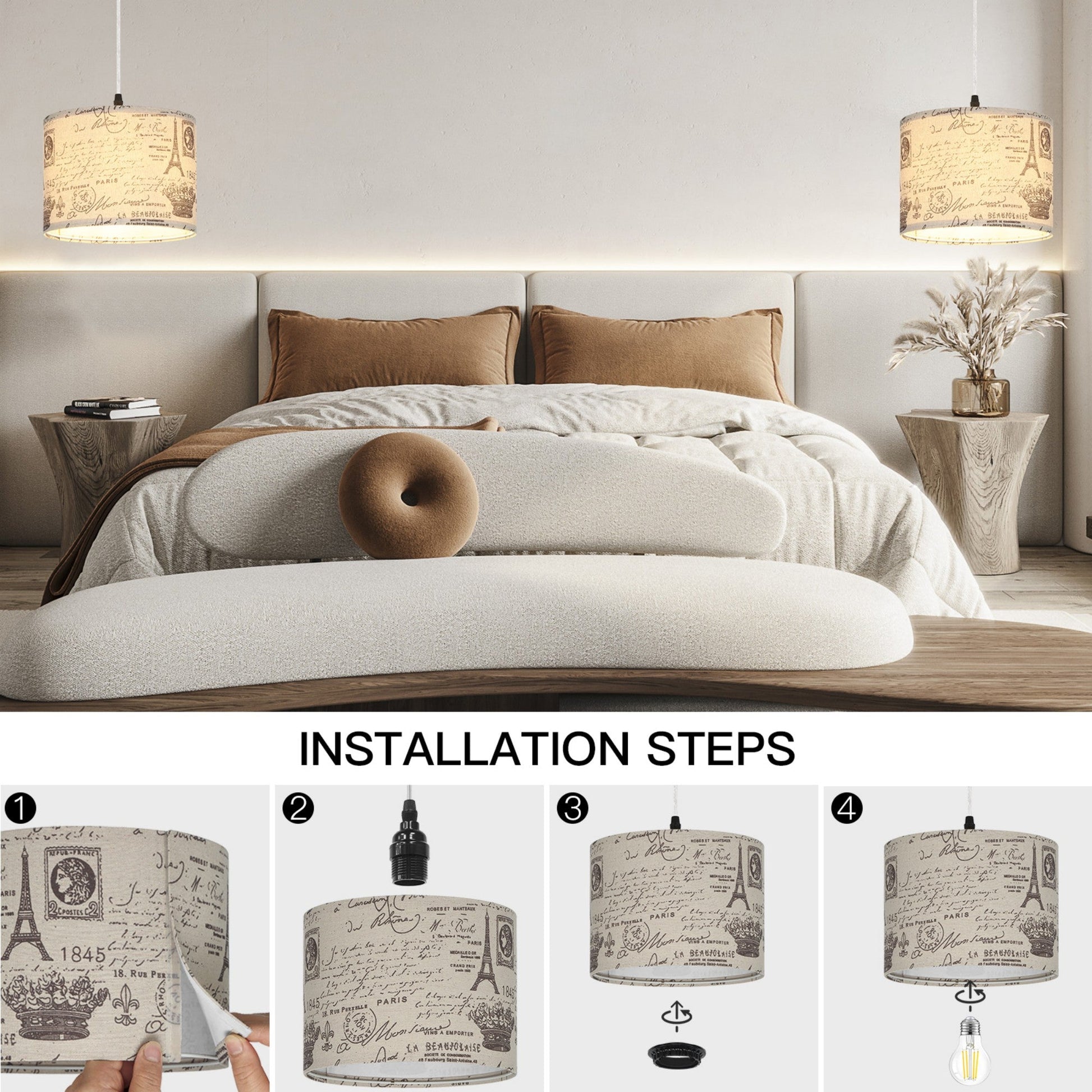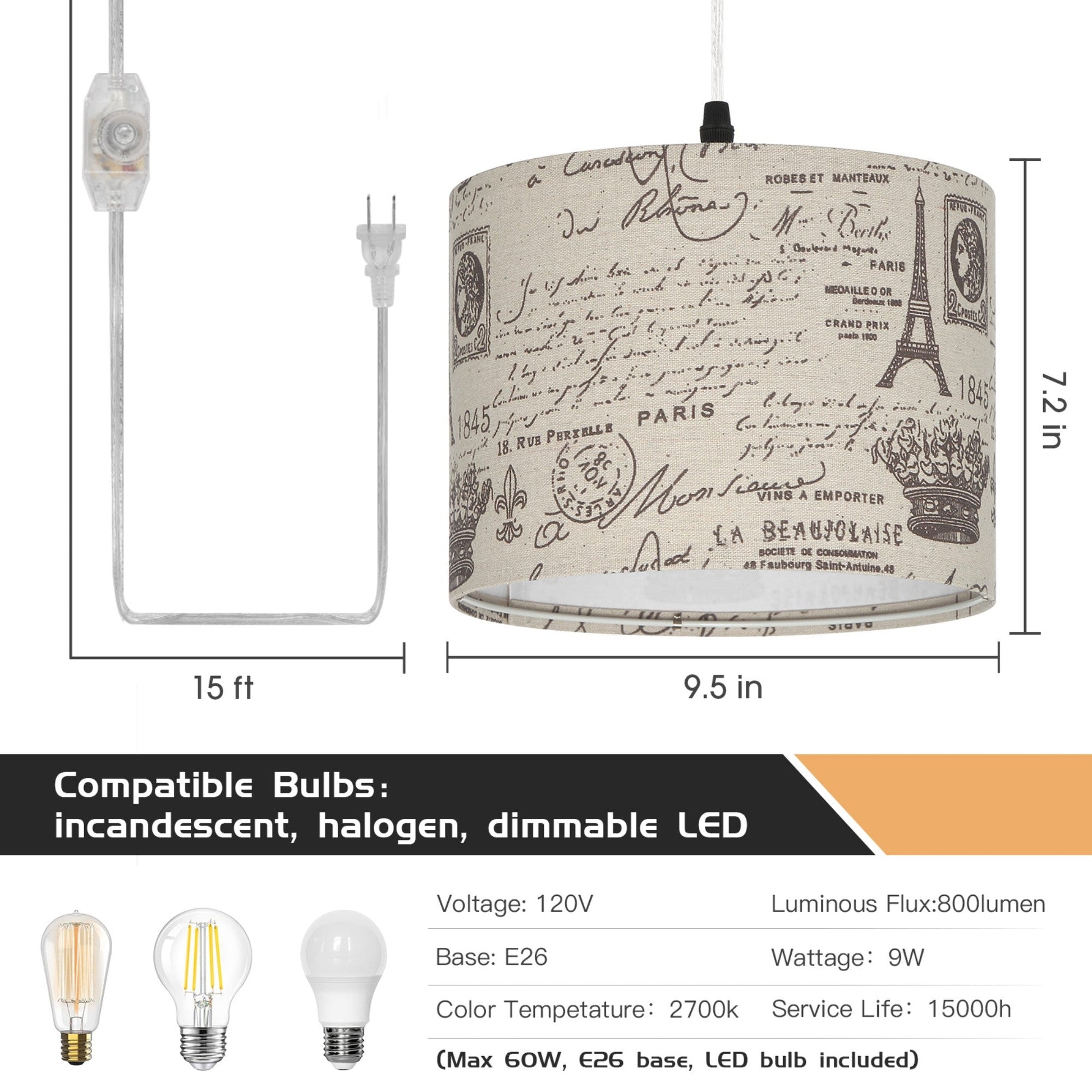 the transparent cord remains unharmed, catering to your installation needs across various ccasions. - Distinctive Romanesque Aesthetics: Our endant light boasts a one-of-a-kind omanesque print shade, seamlessly blending an Eiffel Tower motif into your living space. Elevate your home decor with a touch of medieval-inspired style. The Romanesque lampshade serves to gently diffuse the light, creating a comfortable and natural illumination free from flickering or glare. This contemporary plug-in chandelier is a perfect fit for spaces like bedrooms, living rooms, dining areas, children's rooms, and studies, effortlessly enhancing the ambiance.