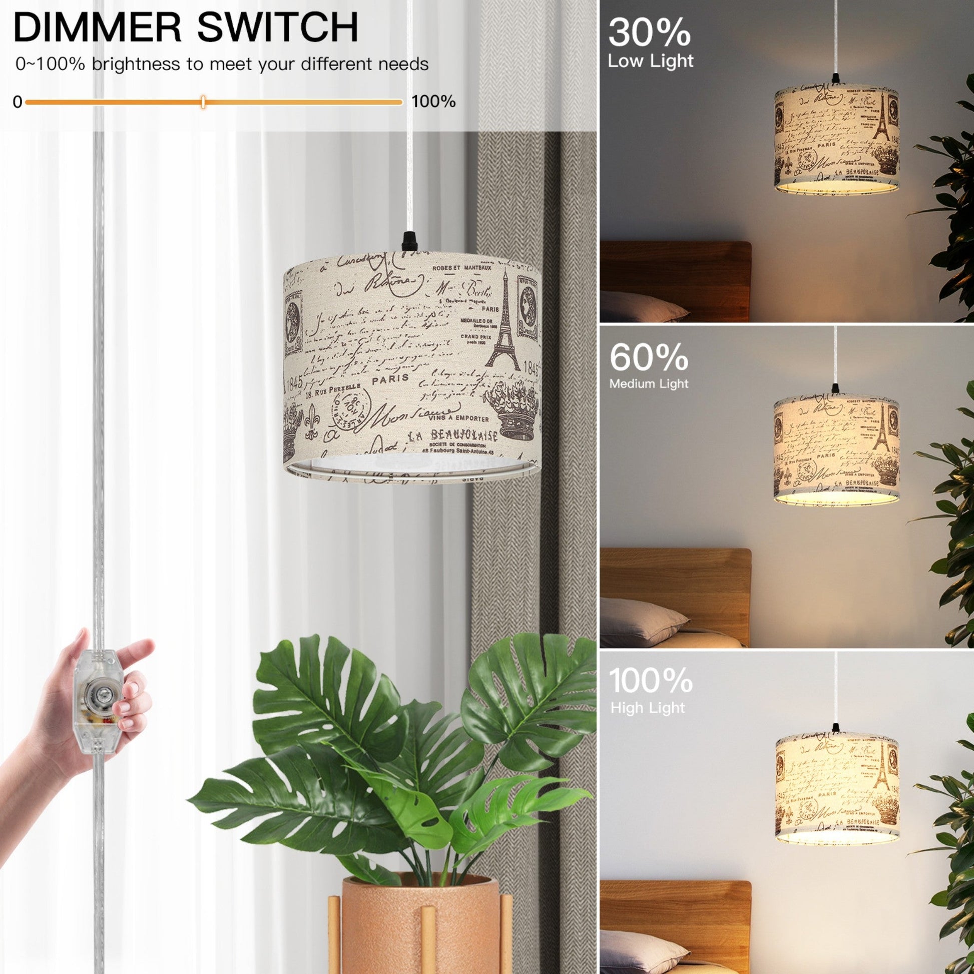 - Adjustable Brightness Pendant Light: Enjoy customized lighting with our dimmable plug-in hanging light. The step-less dimming switch