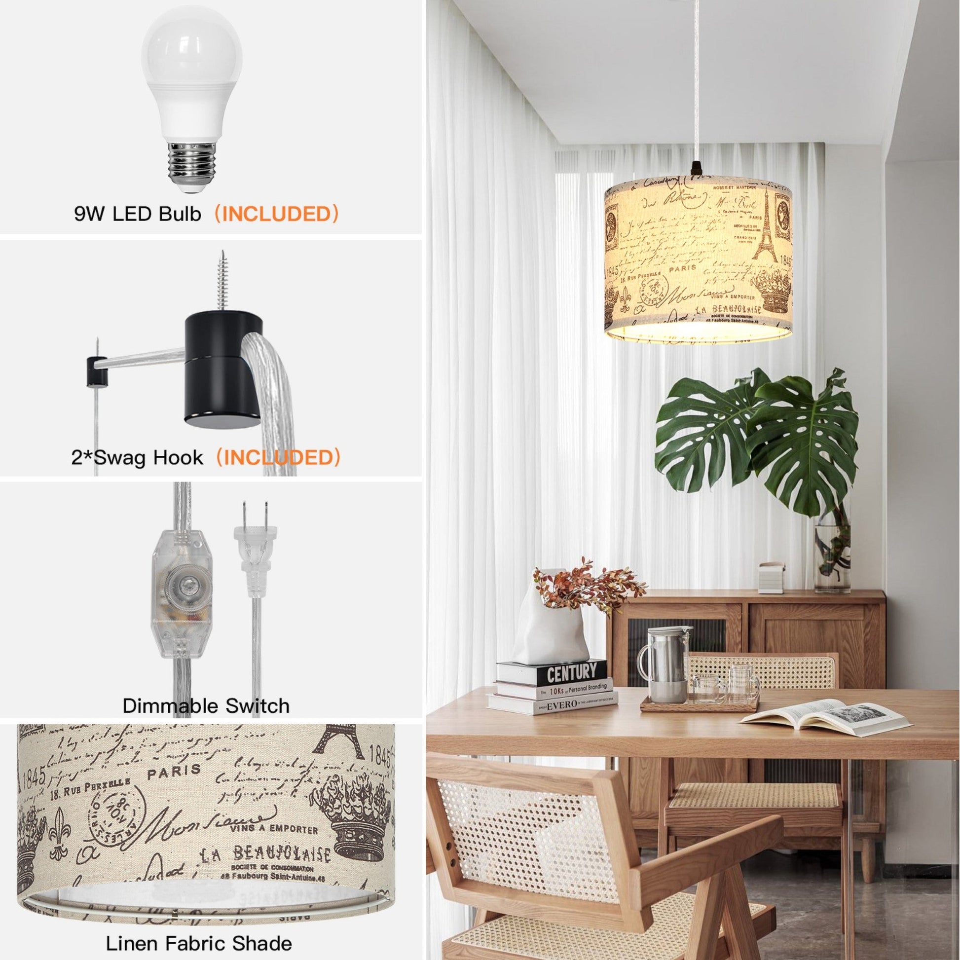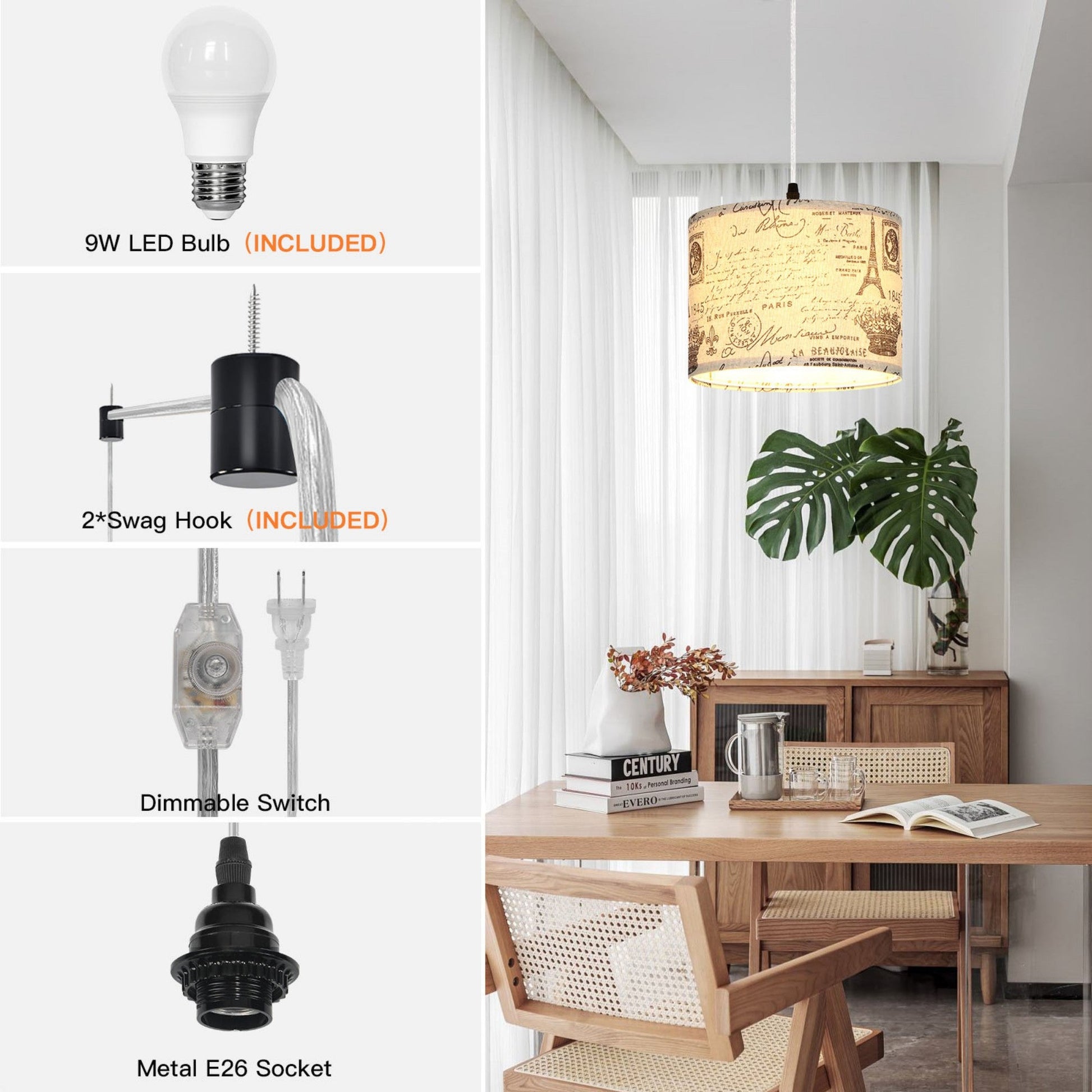 - Simple Installation Process: Our plug-in pendant lighting with cord arrives with comprehensive installation instructions and all necessary accessories (Dowel, Swag Hook, Screw) included. You can set up your lighting solution effortlessly, without the need for any hardwire installation.